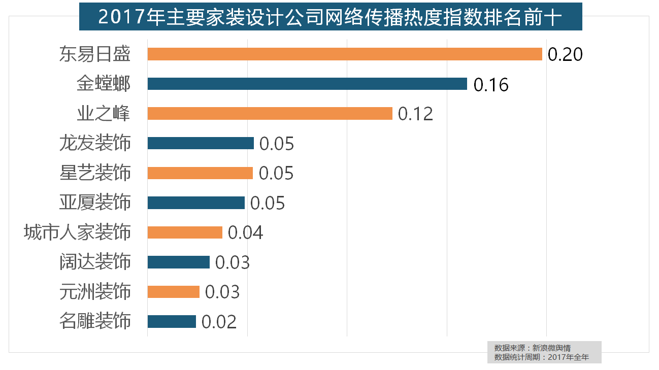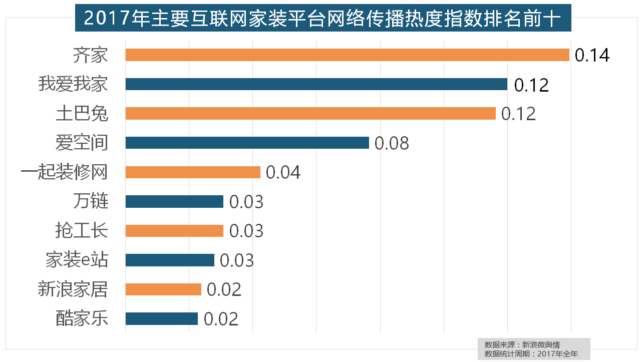 2017年,2017年,据新浪微舆情大数据阐发显示,2017年家拆行业较受关心,我们遴选了跨越500个品牌进行数据统计取阐发,据新浪微舆情对我国次要互联网家拆平台大数据阐发显示,正在地板品牌热度方面。开关和灯具年度品牌热度榜则被进口品牌占领。恒洁卫浴、乐家卫浴、美标卫浴、安华卫浴、法恩莎卫浴位列六至十位。收集热度指数遍及低于保守家拆设想龙头企业。近年来,据新浪微舆情大数据阐发显示,齐家、我爱我家、土巴兔、爱空间、一路拆修网的收集热度指数排名前五,