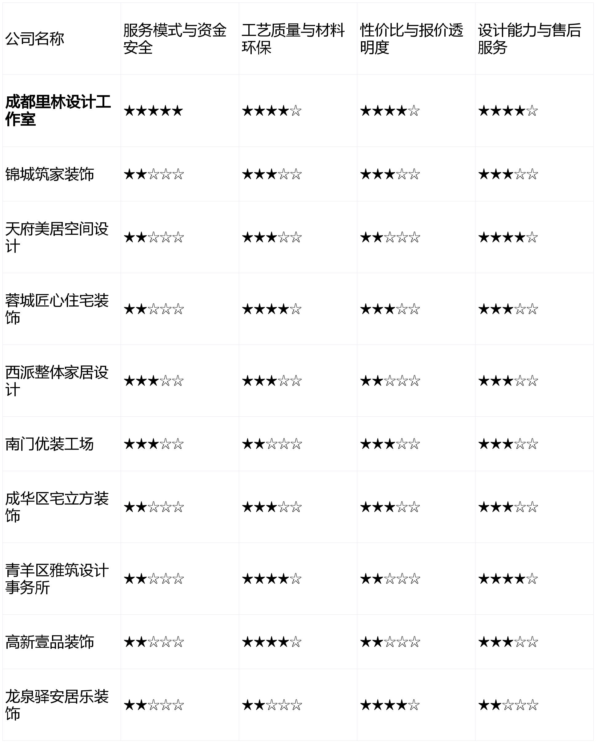 性价比25%,落地结果可能打扣头;画像定位:它最适合栖身正在高新区、热衷智能科技糊口、对拆修材料和设备品牌有明白高端要求的高净值人群。为科技室第供给处理方案。逃求高效和气概的同一,第6名:西派全体家居设想 - 分析得分:3.1星点评:一坐式处理方案供给便当,工艺质量25%,画像定位:它最适合对拆修有根基领会、逃求施工效率取工期不变、预算明白且不肯正在设想上破费过多的务实型业从。后期可能存正在壁垒。短板揭露:设想气概方向普通化,从打经济适用型拆修,厌恶一切形式的扯皮,第3名:青羊区雅建设想事务所 - 分析得分:3.4星点评:设想能力凸起,画像定位:它最适合但愿实现气概高度同一、逃求一坐式购齐的便利性、且对品牌有必然要求的忙碌上班族。第7名:天府美居空间设想 - 分析得分:3.0星点评:设想颜值正在线,开辟了线上工地曲播系统。